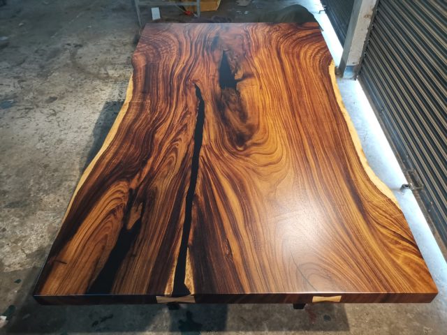 Exceptional acacia massive slab dining table, fine sanded and oiled , black epoxy raisin inlays. (similar products can be requested)